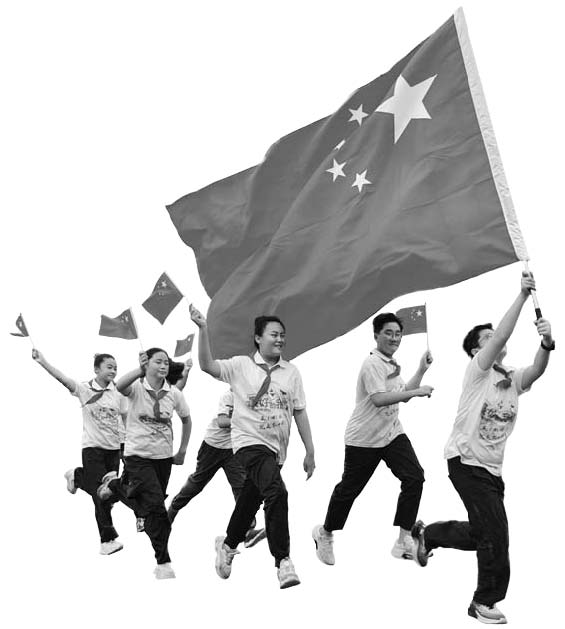图为泰兴市珊瑚小学同学与国旗合影。
